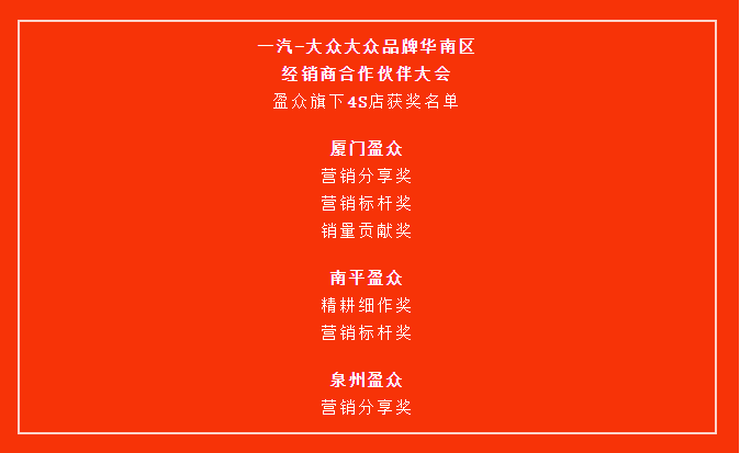 會上,大眾品牌·華南區銷售事業部表彰2018年表現優異的經銷商,盈眾旗下多家一汽-大眾4S店上榜。