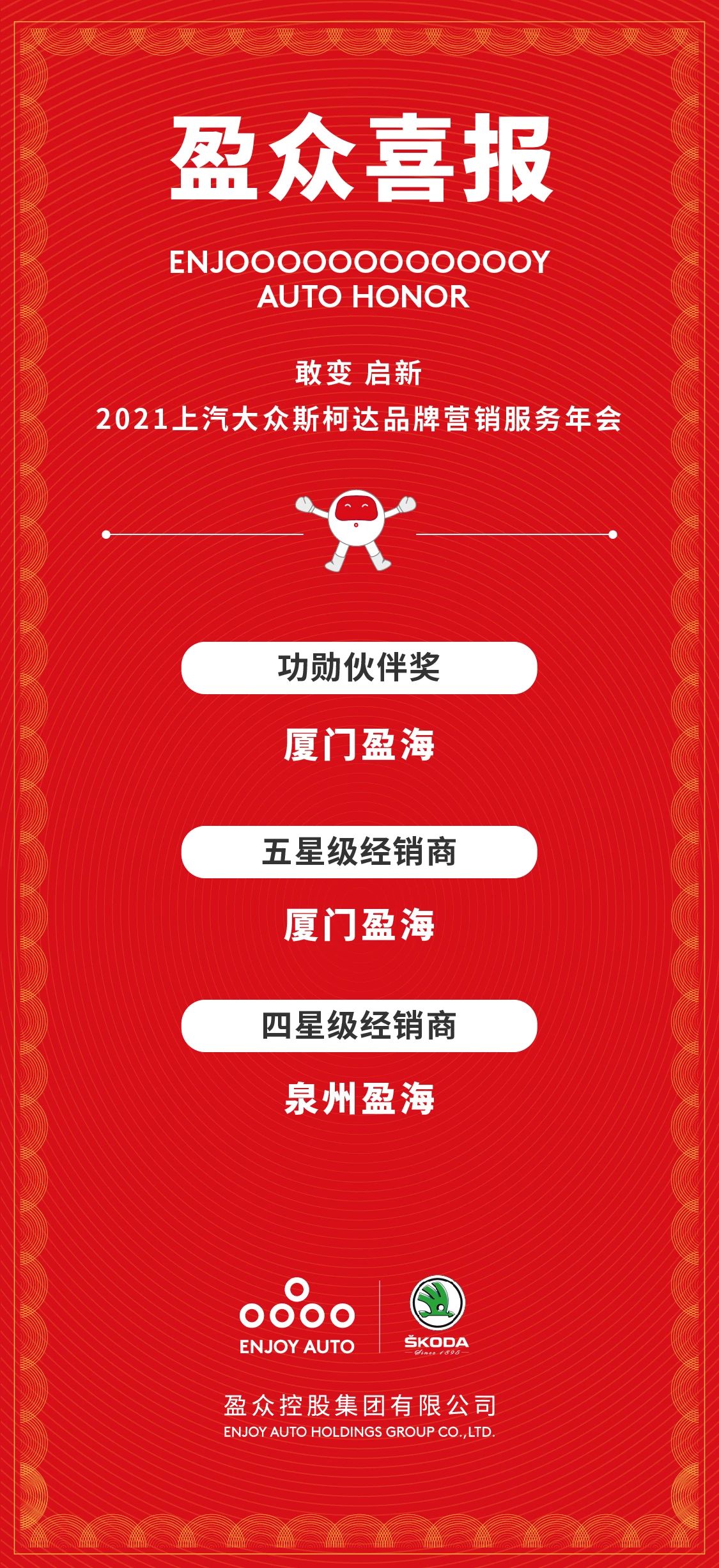 【喜報】盈眾榮獲2021上汽大眾斯柯達功勛伙伴獎、五星級經銷商等多項大獎 2021-02-09 盈眾控股集團 11732次瀏覽 2月9日,“敢變 啟新 2021上汽大眾斯柯達品牌全國營銷服務年會”通過線上直播的形式召開。全國上汽大眾斯柯達經銷商通過網絡直播,共同回顧2020年奮進的足跡,凝心聚力,堅定信心,邁向2021。 盈眾控股集團憑借2020年出眾的銷售業績、高標準的服務水平以及優秀的企業經營能力,榮獲多項大獎。其中,廈門盈海獲得上汽大眾斯柯達品牌功勛伙伴獎,并第12次獲得五星級經銷商榮譽稱號,泉州盈海榮獲四星級經銷商榮譽稱號。 2020年,盈眾斯柯達團隊以堅韌不拔的意志和乘風破浪的勇氣,拼搏奮進,再創佳績。這離不開每一位盈眾人的付出,更離不開每一位客戶的關注與支持。 盈眾控股集團將始終秉持“用科技和文化,讓人們的汽車生活更美好”的企業使命,始終以客戶為中心,持續為客戶提供汽車全生命周期的優質服務,開拓進取,不斷超越,為廣大客戶創造更加美好的汽車生活。 點贊 0 上一篇 下一篇