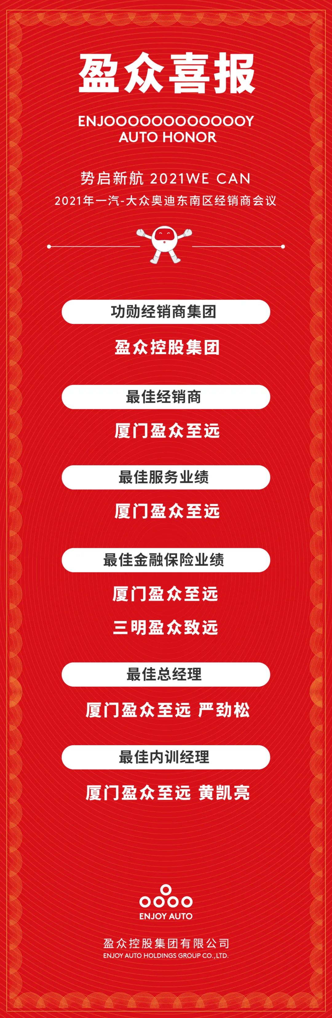 在此次奧迪東南區會議上,盈眾控股集團憑借年度出色的業績能力及經營管理表現,榮獲“功勛經銷商”等多項榮譽。廈門盈眾至遠表現突出,榮獲最佳經銷商、最佳服務業績、最佳金融保險業績榮譽,三明盈眾致遠同樣榮獲最佳金融保險業績獎。此外,廈門盈眾至遠總經理嚴勁松、培訓經理黃凱亮獲得個人榮譽表彰。