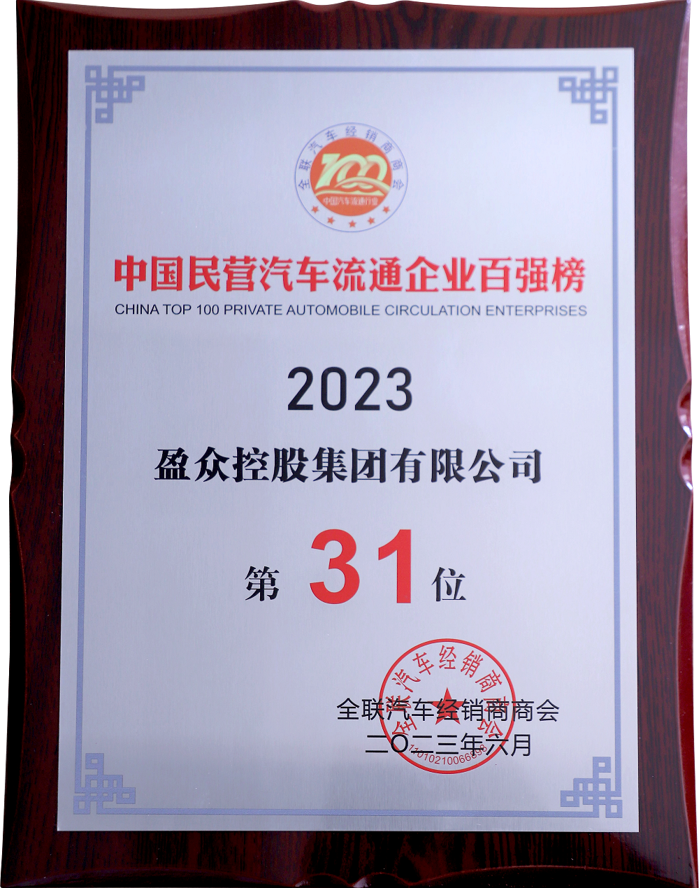 盈眾控股集團成功入選“中國民營汽車流通企業百強榜”,位列第31位。
