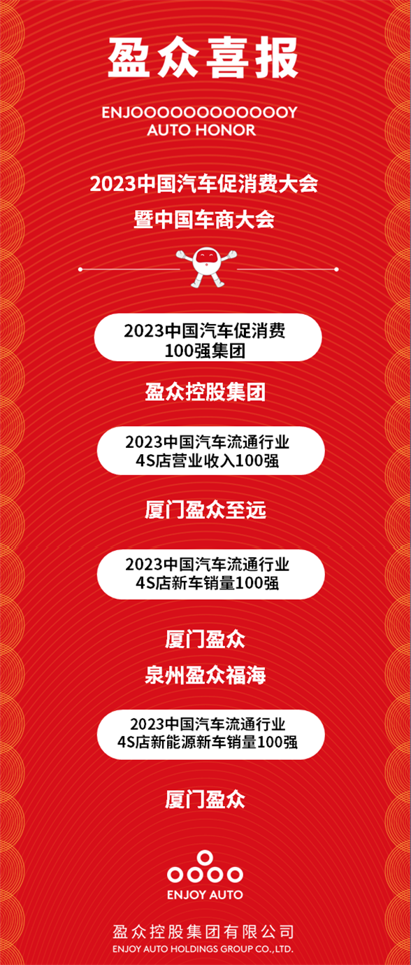 本次入圍多個榮譽榜單,是對盈眾控股集團在汽車銷售服務行業深耕細作、創新不止的高度認可。作為福建省規模領先的汽車經銷商集團、福建省在中國汽車流通行業中的代表企業,盈眾將不忘初心,專注汽車銷售服務行業,堅持以客戶為中心,持續深化改革,緊跟時代發展,加快創新步伐,在為中國汽車消費市場發展持續貢獻力量的同時,也為廣大客戶提供更豐富、更具活力的美好車生活服務。