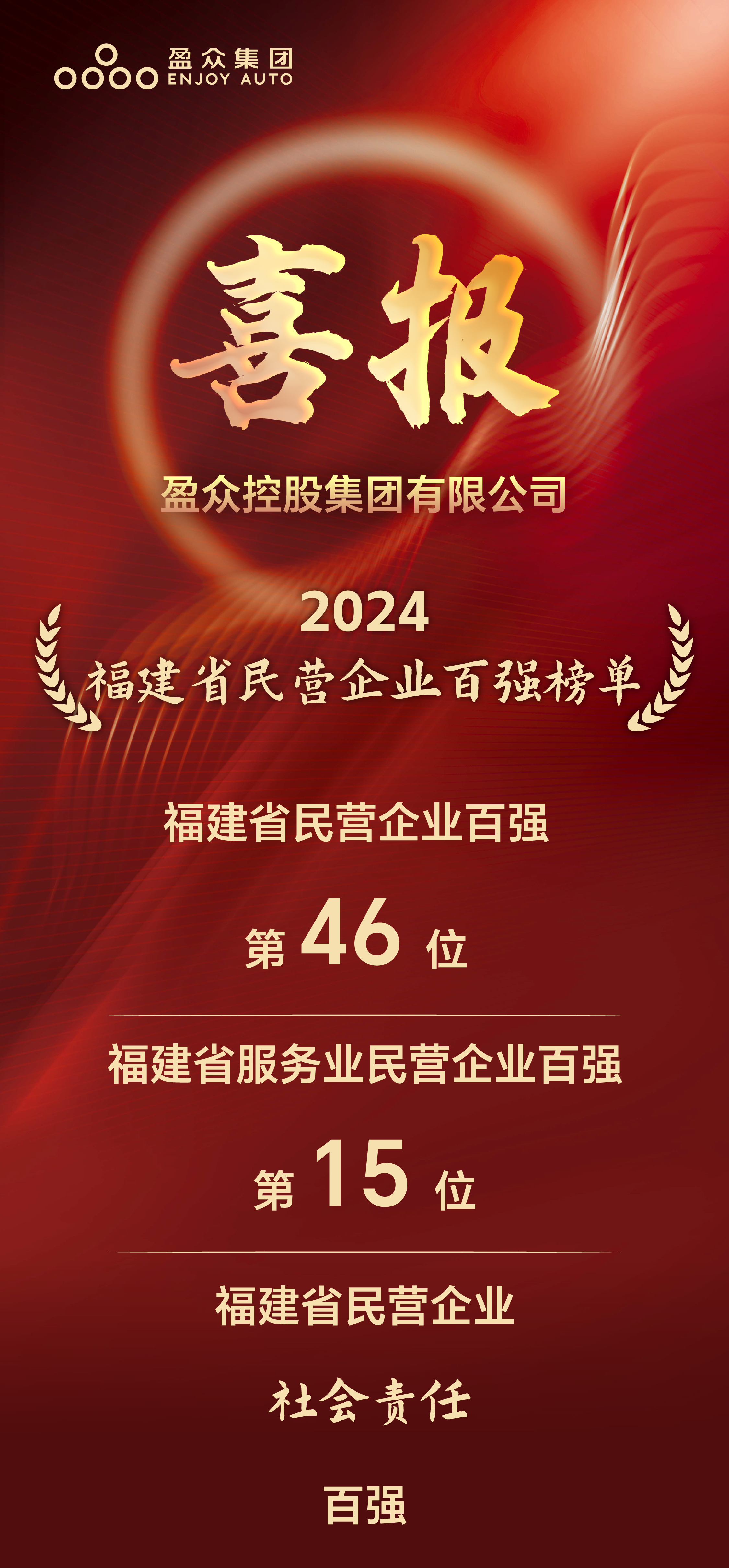 9月19日,福建省工商聯權威發布2024年度福建省民營企業百強榜單,包括2024福建省民營企業100強、服務業民營企業100強和福建省民營企業社會責任100佳。盈眾集團以優異表現榮登榜單,位列福建省民營企業100強第46位,福建省服務業民營企業100強第15位,同時,盈眾控股集團還入圍“福建省民營企業社會責任100佳”。