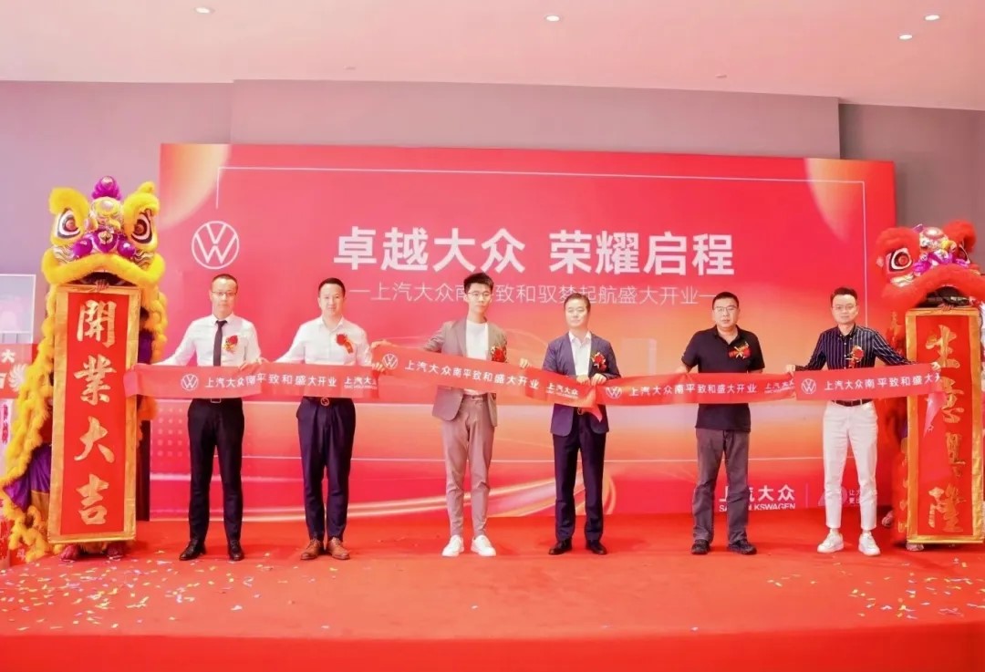 上汽大眾華南區總經理徐子看、盈眾控股集團副總經理尤猛杰、上汽大眾大眾品牌華南營銷大區ID營銷副總經理張榕、盈眾上汽大眾品牌總監王庭要、盈眾業務四部總經理陳隆龍、南平致和總經理許恩華共同為南平致和上汽大眾4S店開業剪彩。